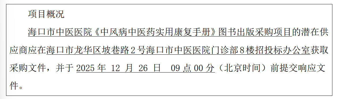 项目名称:海口市中医医院《中风病中医药实用康复手册》图书出版采购项目
